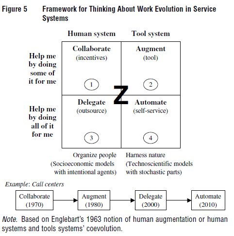 Service Science emerged from IBM as their business transitioned from hardware to software to services. Jim Spohrer in “The Emergence of Service Science: Toward Systematic Service Innovations to Accelerate Co-Creation of Value” provides a diagram of the evolution of automation of a manual task.