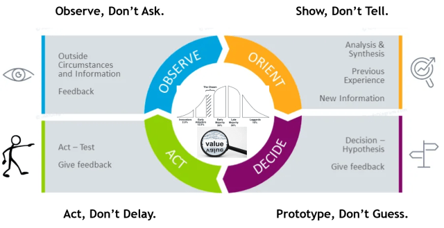 As I play with this simplified diagram, I realize it fits nicely underneath all of the steps and frameworks in the complex diagram. The “observe” step is obviously the “observe, don’t ask” step. The “orient” step fits nicely with what I mean by “show, don’t tell.” The “act” step needs a reminder of don’t dilly dally with “Act, don’t delay” which is the fundamental speed insight of Boyd. The decide step fits a mantra of “prototype, don’t guess.” So many times in the product development process, the software engineers are forced to guess what is meant by a user story or a requirements document or a short discussion during a daily stand-up. What human centered design practitioners learn early on is to do rapid prototyping even if it means doing paper prototyping.
