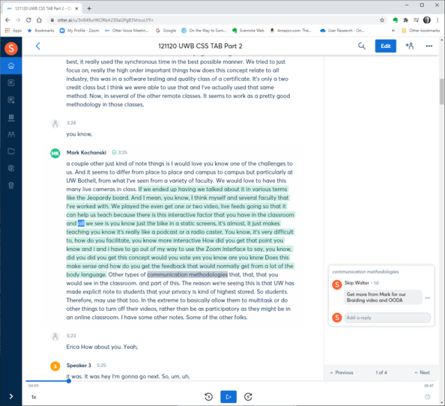 Otter.ai recently announced how their tool can provide real time transcripts of a meeting. The hidden benefit of the new capability is that you can make annotations of the Zoom stream in real time. One of the first talks was from Mark Kochanski about what the professors are learning about remote instruction during the age of the pandemic. I was positive Mark was going to share something I needed to remember.