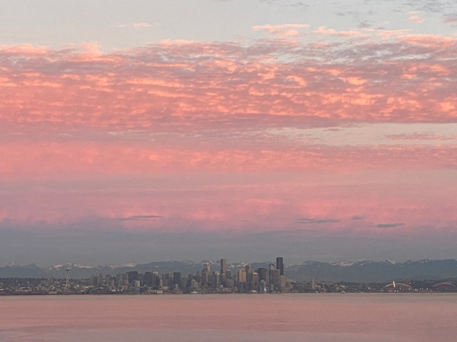 We often get great colors from sunrises over Seattle. It is a special treat when we get pinks and oranges at sunset.
