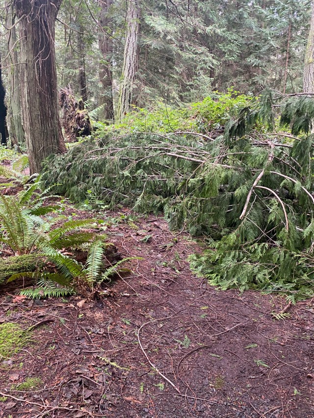 After weeks of rain and a windstorm with 70 mph gusts, our power was out for a day. Most of the trees which downed power lines and obstructed roads are cleaned up in days. However, the obstructed trails take weeks to clean up.