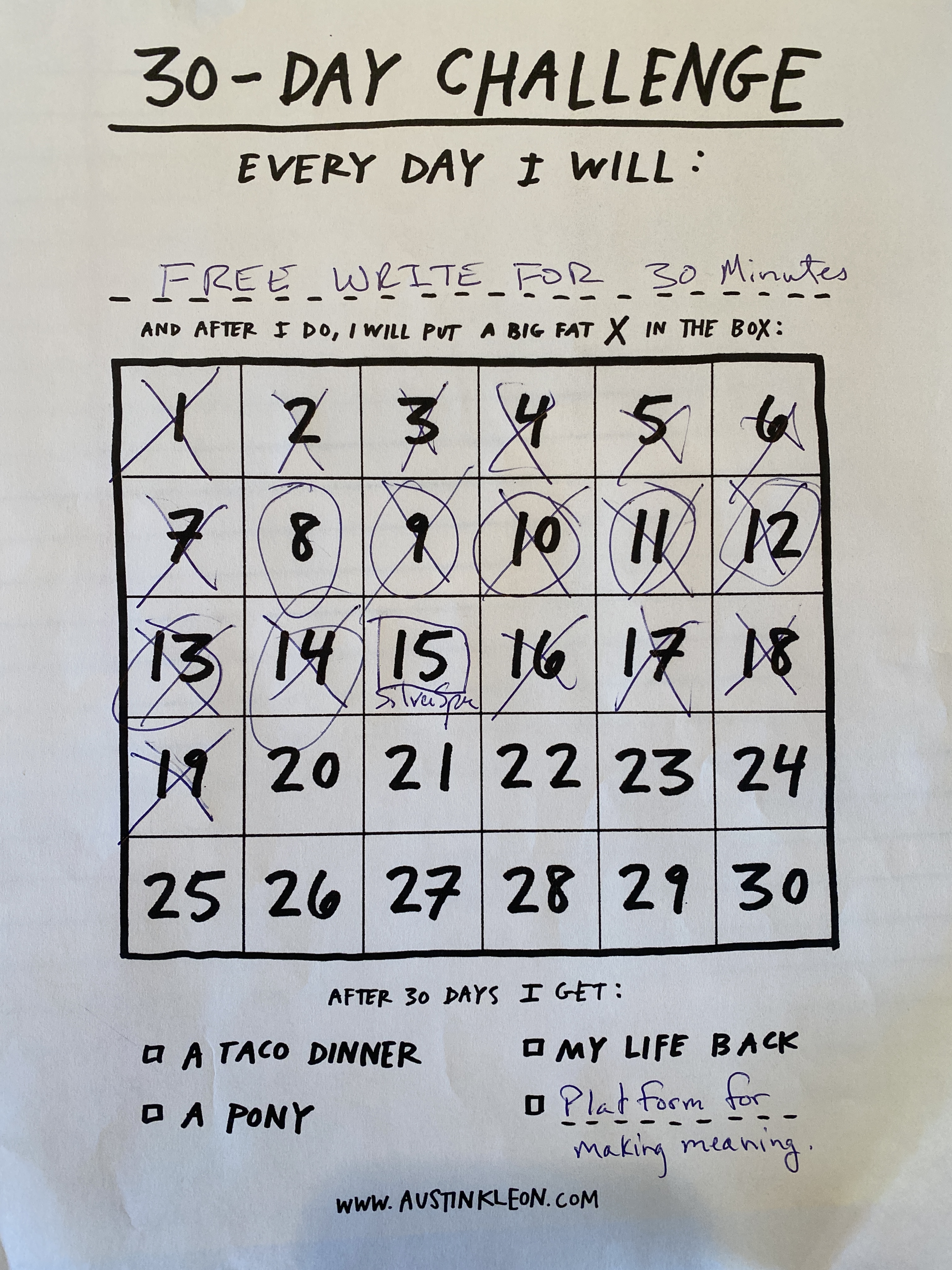 I printed out Kleon’s simple check box for the 30 day challenge and started writing.