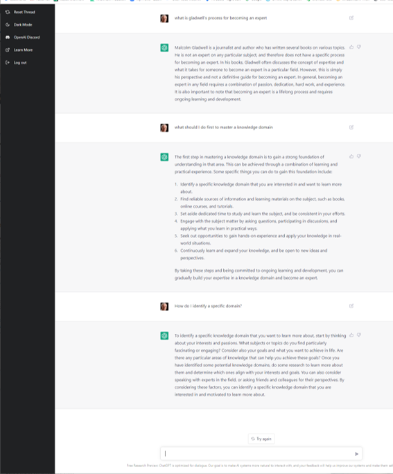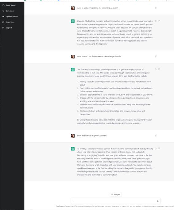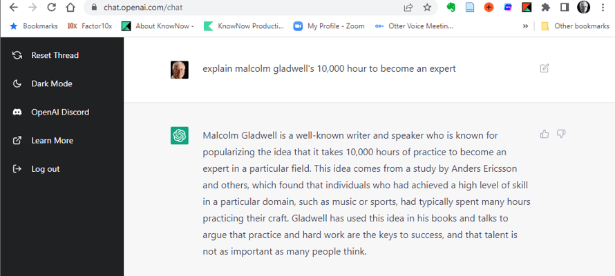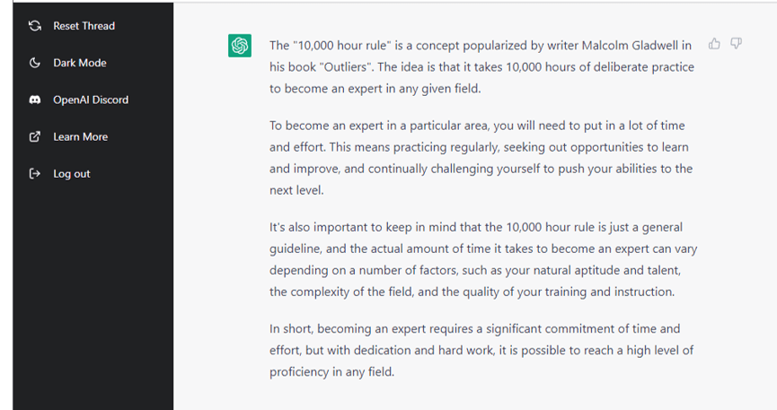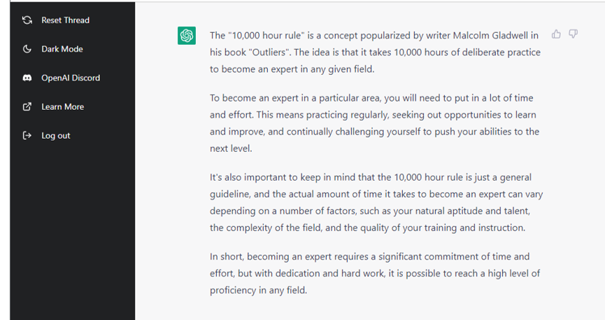 I asked GPT Chat to explain Malcolm Gladwell’s 10,000 hours to become an expert: