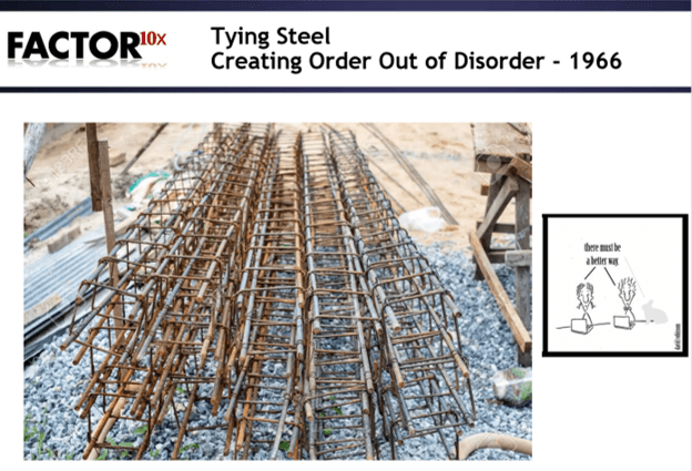 The first lintel tied steel that we did took two of us three full days of backbreaking work. The construction supervisor showed us how to do it (See One) and then the two of us did it (Do One). As we started on the second one, I knew there had to be a better way. A part of the better way was sitting while we did the work. I did not realize that sitting on a construction site was something that one never did. After the construction foreman, chewed me out for fifteen minutes, I showed him how much more productive we were. He thought for a few minutes and then said “OK, I will let you do it your way. But if the big boss from Charlotte, NC, comes up to observe I want you to go back to doing it my way.”
