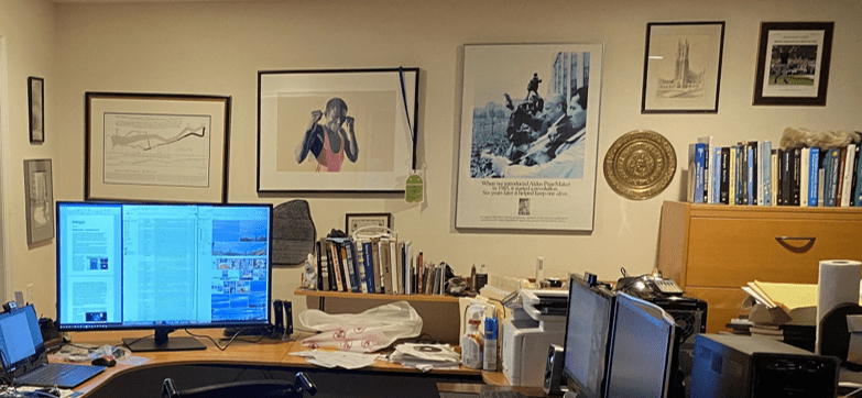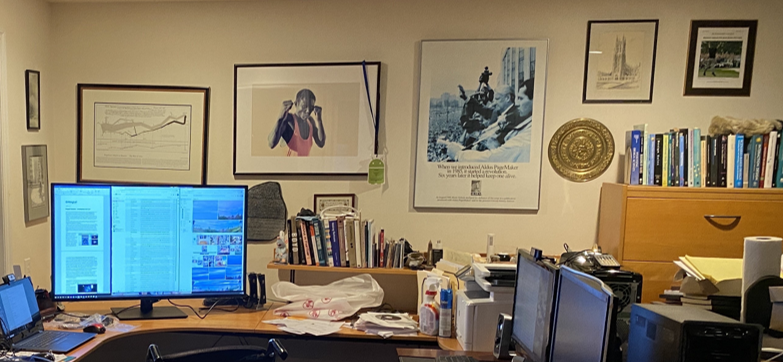 My desk art objects sit on a shelf in front of the larger images that provide a context for my daily work. After six months of being away from this space, I am about to reenter my home office. I can’t wait.
