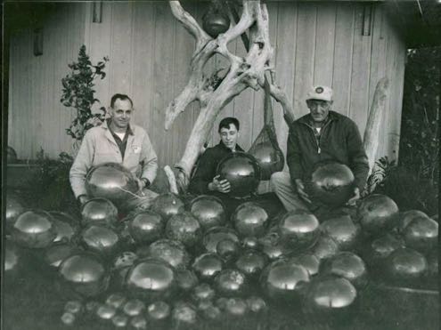 Shortly after seeing these images, we visited the Carberry Glass studio of Ann and Morgan Seeley. They had several glass sculptures that reminded me of the fishing floats. The yellow striped version caught my eye as it reminded me of the sun glancing off the floats.