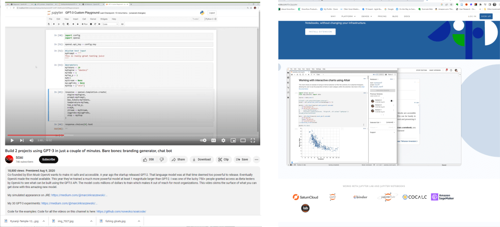 - Transform and Augment One – I envision transforming Jupyter notebooks through generative AI using Chat GPT and GPT 3.5 to generate the code sections of a Jupyter notebook from the English prompts in the narrative section of the notebook. I even speculate that you could generate Artwork, diagrams, and charts from GPT.