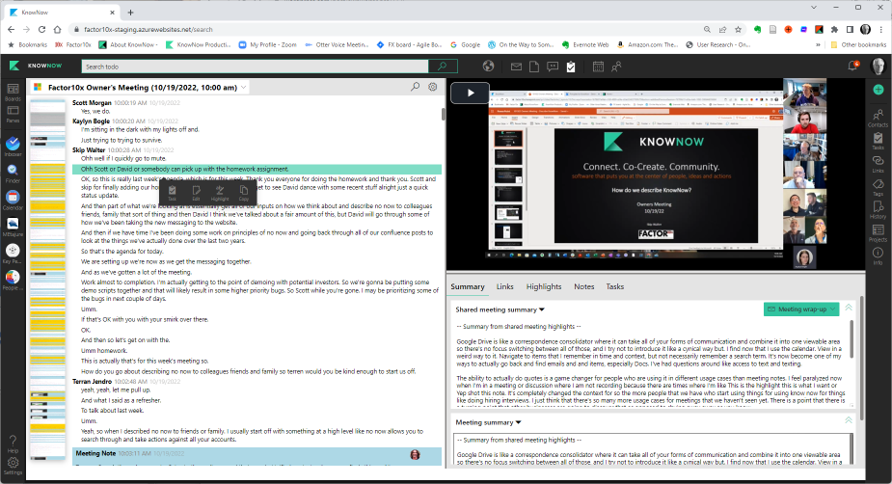 - Understanding that the Grain.co video highlighting features could lead to a powerful KnowNow Meeting Summarization tool with visual analytics to understand how decisions and actions flow over time.