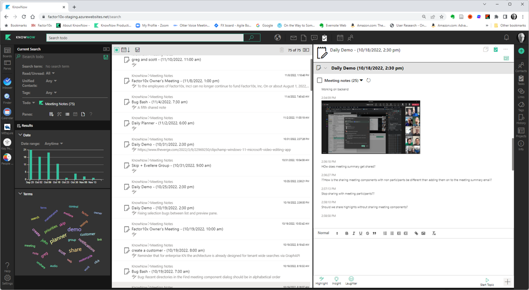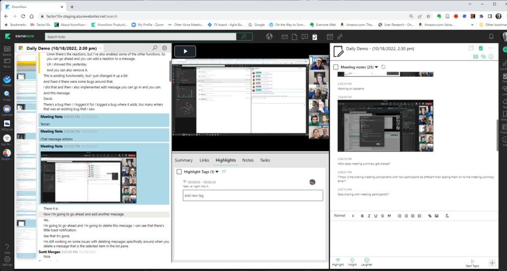 In developing KnowNow, I insisted on having a time stamped notes capability for our meeting notes features. I wanted to be able to directly link my notes through the time stamp to the video and automated transcript.