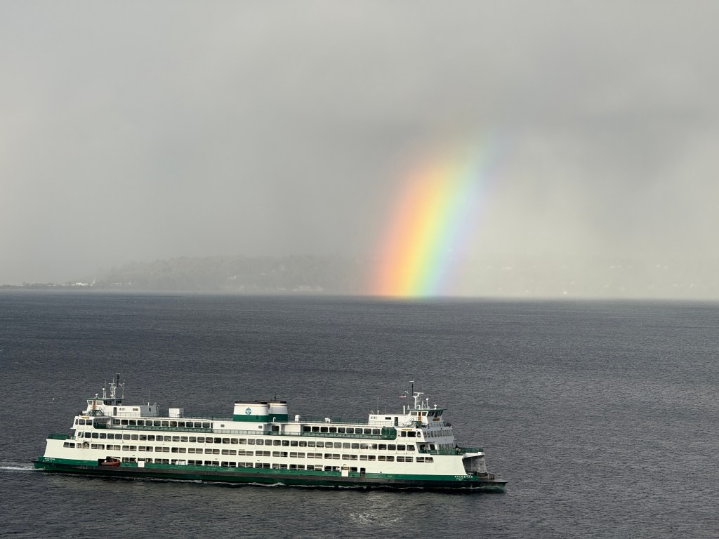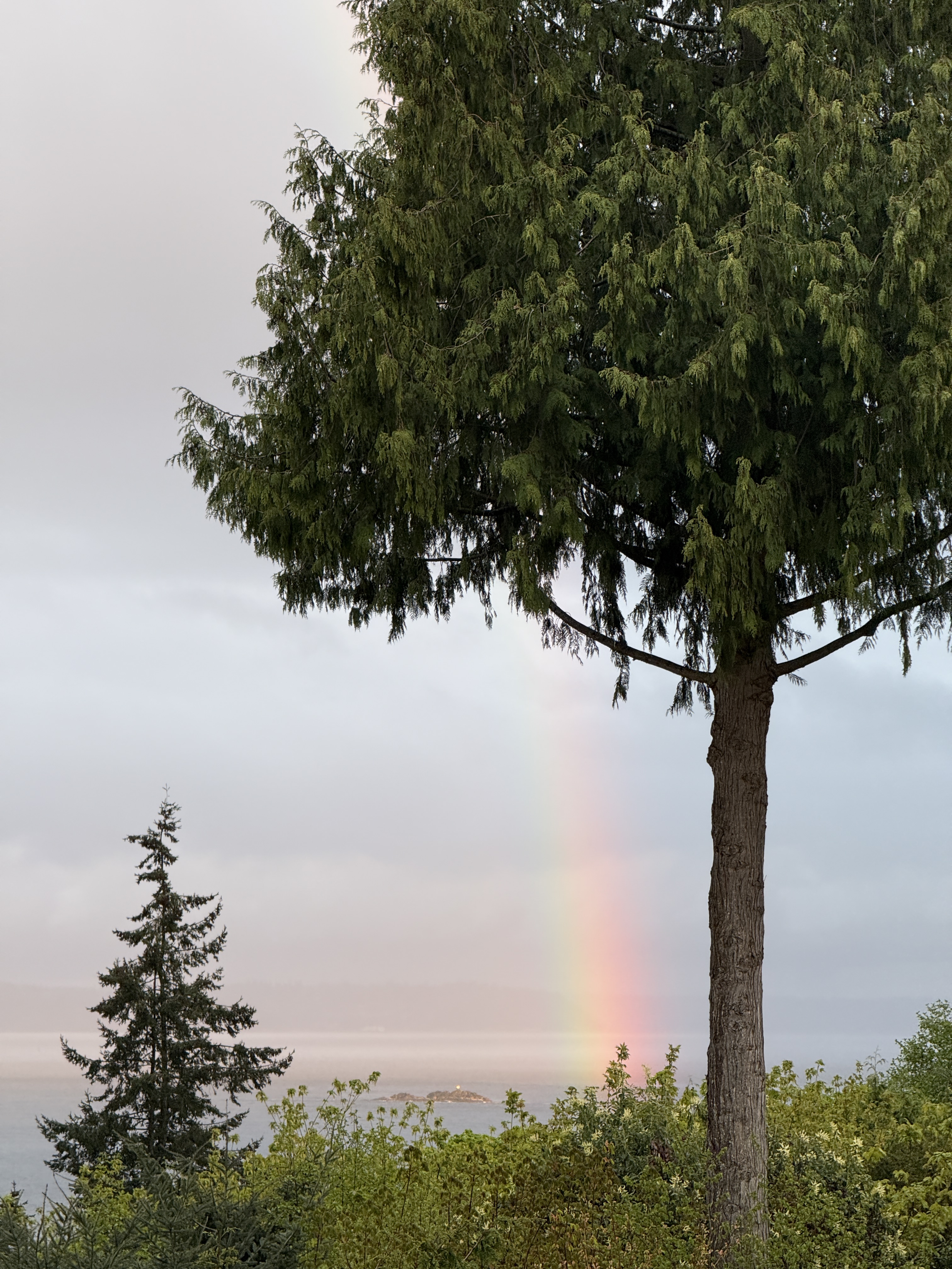 Yesterday a rainbow appeared in a place we’ve never seen one before – behind a tall tree on our island’s bluff.