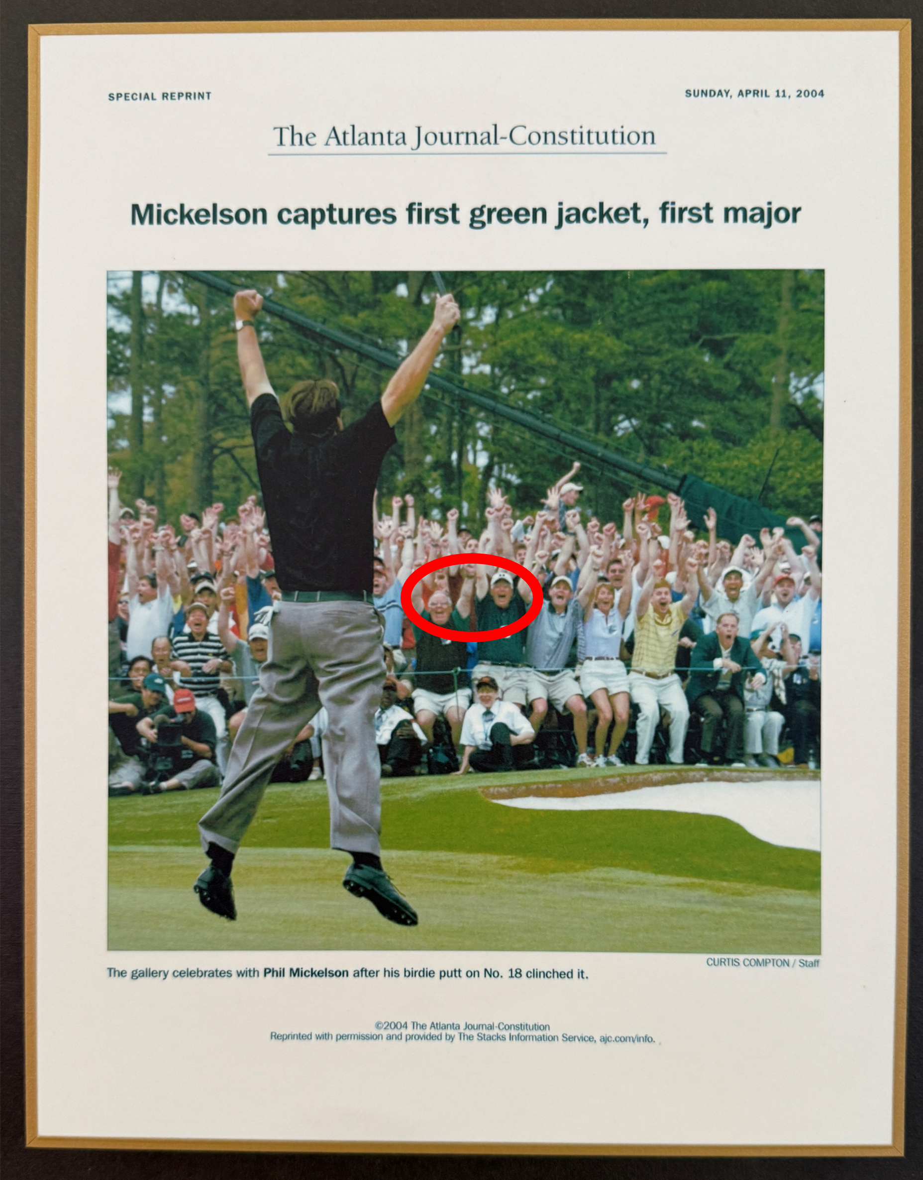 In the photo below, I’ve circled the location of my brother and me in the first row. We were in the process of leaping to celebrate Phil Mickelson’s made putt to win his first green jacket in 2004.