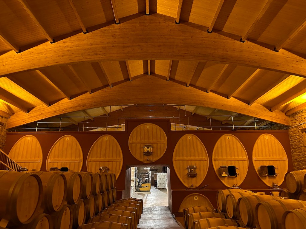 I am fascinated with the architecture of each winery. While on the outside of the winery the walls are made of stone, on the inside beautiful old wooden beams predominate. I love the different aging barrel sizes that populate European wineries. In the US, one size of barrel tends to dominate. I couldn’t resist poking my head into the large oval wooden barrels.