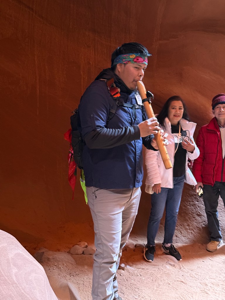 When I could shift from being mesmerized by the colors, I could see the layers of sand compacted over the eons. Each line represents thousands of years out of the millions of years it took to form the canyon. As we stopped in a wide place in the canyon, our Navajo Guide pulled out his hand carved flute and began playing a haunting tune. His presence reminded me that while the canyon was millions of years old, the Native American peoples have inhabited this area for thousands of years.