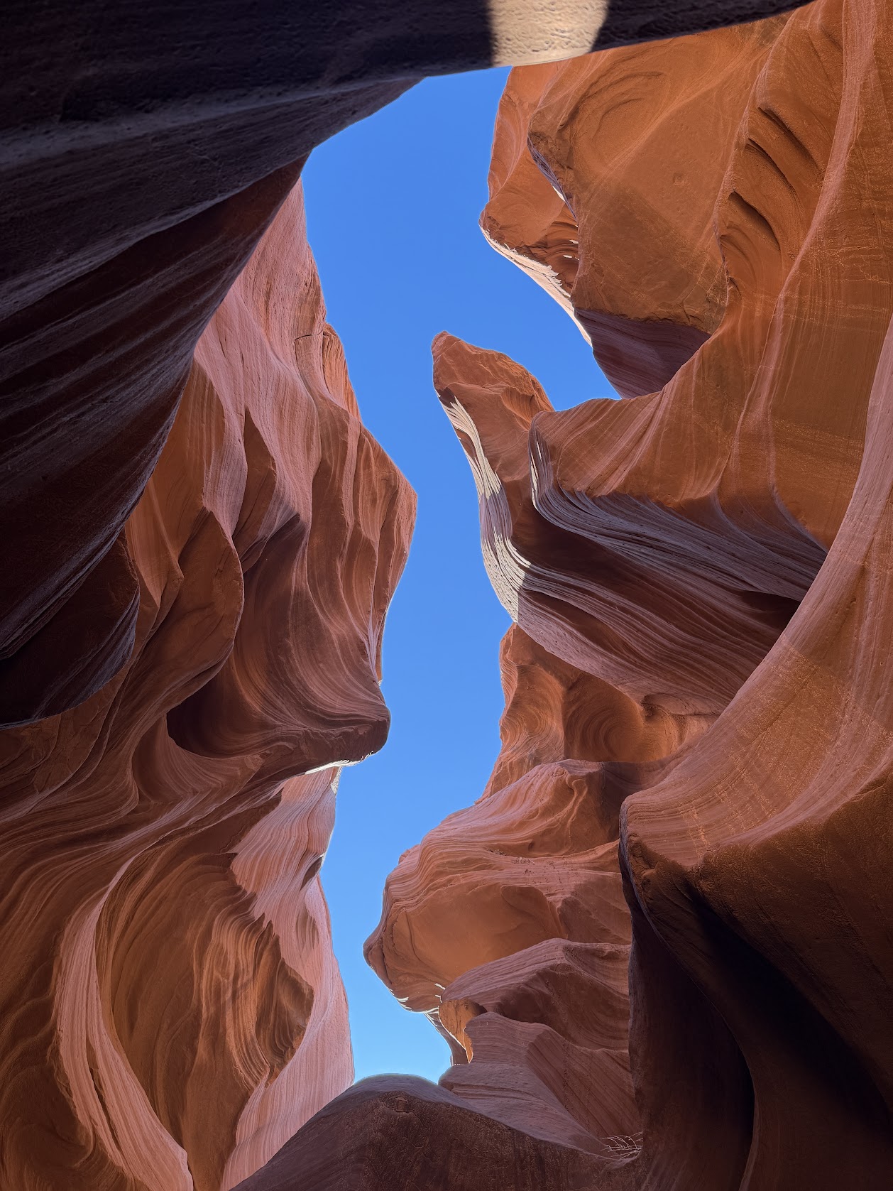 The public tours are a relatively noisy untamed tourist attraction. But once I entered the canyon the unique light and color displays overwhelmed. Everywhere I looked there was another “painting with light” opportunity. I just wanted to find a place to sit and almost microscopically capture each shift in light and color and shadow. From the deep blue of the sky to the many shades of orange brown to the dark shadows of orange and brown, I couldn’t begin to pick out a place to focus.